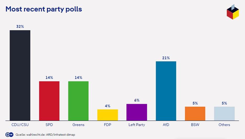 У санитарни кордон или Brandmauer у Њемачкој спада петорка: ЦДУ/ЦСУ, СПД, Зелени, Љевица и ФДП. Све ове партије имају мање-више слична становишта о унутрашњој и спољној политици, с тим да поједине стављају у први план традицију, друге економију и екологију, а треће слободе. Све те партије чине либерали. Проблематична партија коју треба запречавати због свог радикализма је Алтернатива за Њемачку (АфД), а понекад и Покрет Саре Вагенкнехт. Први спадају у радикалну десницу, а други у љевицу. Према посљедњим истраживањима, АфД би требало да заузима друго мјесто по гласовима са 21%, послије Уније која осваја 32%.