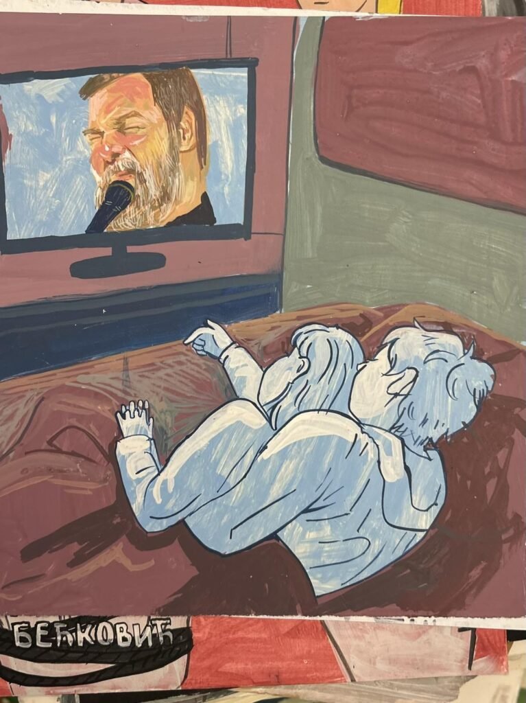 У мом сликарству један од важнијих задатака је ревизија поимања народне музике. Мени можда фали нека структура или грађење, можда стрпљење и фокусираност коју има писац, али мој задатак је да будем летећи и да директно хватам неукус за перчин. Под неукусом се, наравно, подразумева све што нису народњаци.