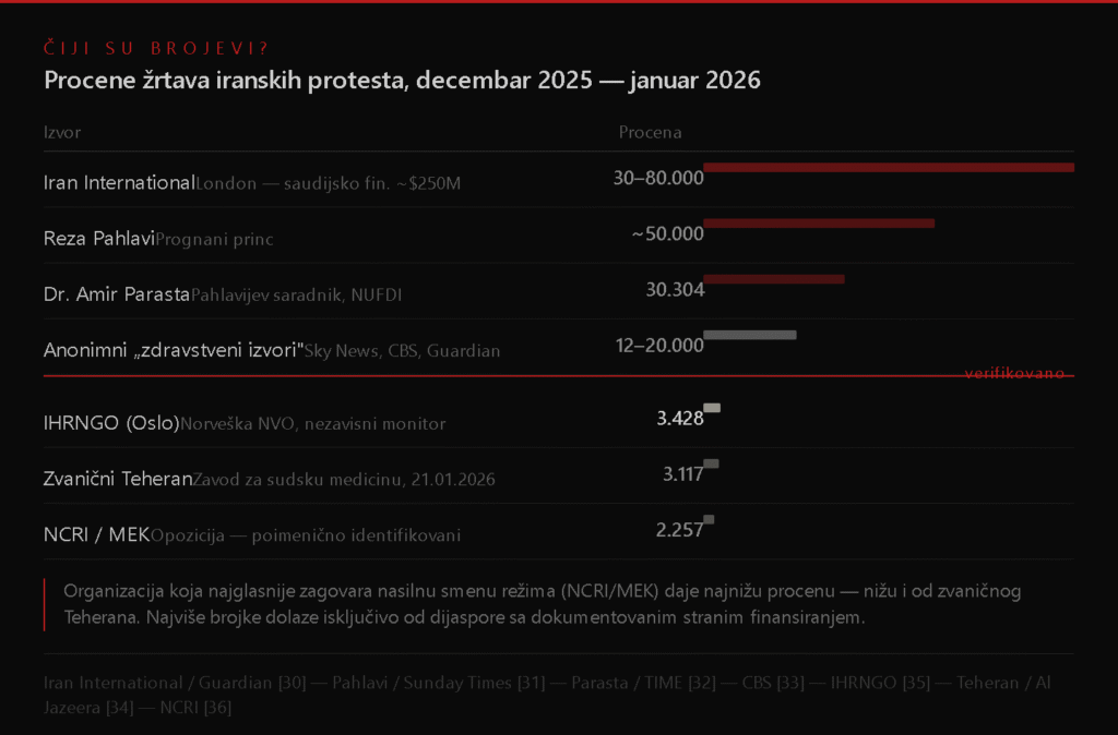 Procene o 30.000 do 50.000 mrtvih lansirali su Iran International, medij sa sedištem u Londonu koji je do nedavno finansirala Saudijska Arabija, zatim Reza Pahlavi, prognani princ koji je tvrdio da je samo u Teheranu ubijeno 15.000, i Amir Parasta, hirurg povezan upravo sa Pahlavijem, čije su „ekstrapolacije bolničkih podataka“ dospele u Zapadne medije. Jedan od navodnih izvora su bile i anonimne „zdravstvene službe“ koje su izveštavale za Sky News, CBS i Guardian – uvek neimenovane, uvek sa enormnim brojkama i rasponima.