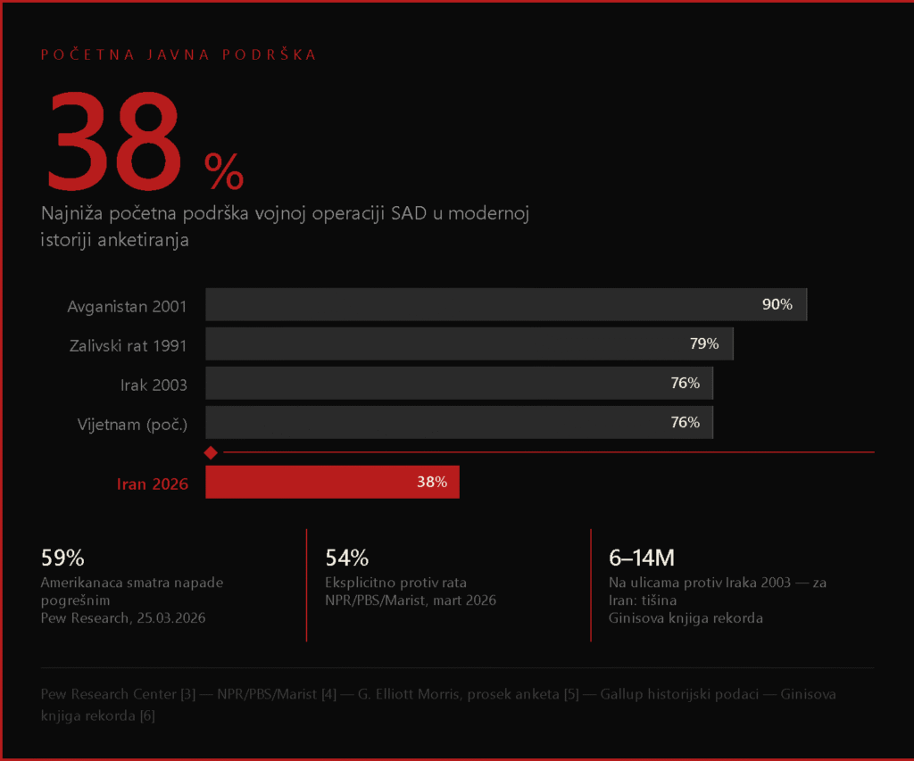 [2] Pew Research Center (25. mart 2026): 59% Amerikanaca smatra napade na Iran pogrešnim; 61% ne odobrava Trampovo postupanje. Najniža početna podrška vojnoj operaciji SAD u modernoj istoriji anketiranja.