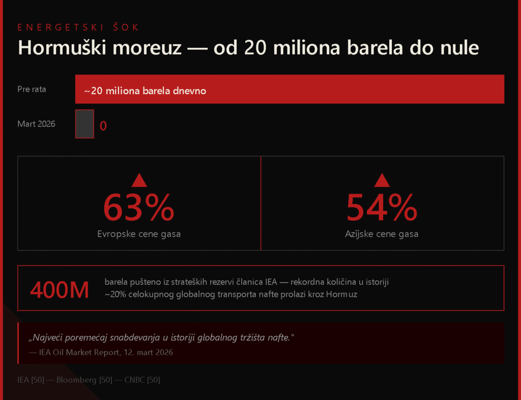 [40] IEA Oil Market Report (12. mart 2026): „Najveći poremećaj snabdevanja u istoriji globalnog tržišta nafte.“ Protok kroz Hormuški moreuz pao sa ~20 mb/d na skoro nulu. Članice IEA pustile rekordnih 400 miliona barela iz strateških rezervi. Evropske cene gasa porasle 63%, azijske 54%.
