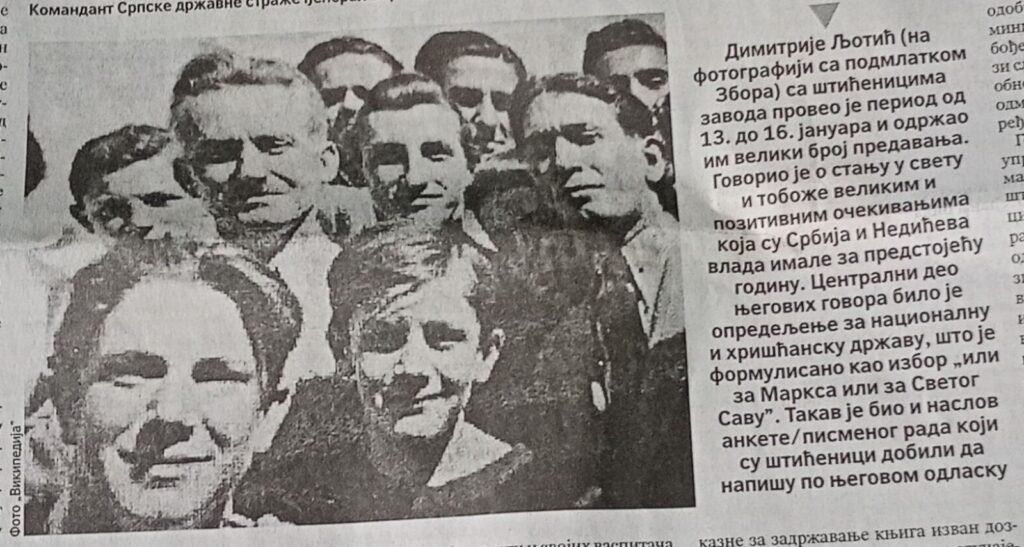 Други пример је подстакнут читањем фељтона у Политици о Заводу за принудно васпитање омладине (1942-1944) у Смедеревској Паланци, који је основао Недић, а идејни творац био Љотић. У одељку под насловом „Божић у знаку славља и репресије“, уз слику Љотића са подмлатком његовог Збора, наводи се да је он у периоду од 13. до 16. јануара 1944. одржао велики број предавања „штићеницима“ Завода. „Говорио је о стању у свету и тобоже великим и позитивним очекивањима која су Србија и Недићева влада имале за предстојећу годину. Централни део његових говора било је опредељење за националну и хришћанску државу, што је формулисано као избор ‘или за Маркса или за Светог Саву’. Такав је био и наслов анкете/писменог рада који су штићеници добили да напишу по његовом одласку“.5