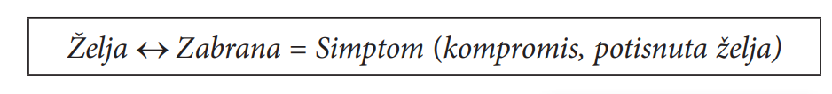 Red koji Priroda podrazumeva ili „hoće“ jeste potpuni nered sa stanovišta Kulture, na isti način na koji je red u nesvesnom delu psihe potpuni haos za svesni deo. Iz tako različitih stremljenja prirode i Kulture, svesnog i nesvesnog i proizlazi čovekova pocepanost i rađaju se patnje i bolesti. To se najlakše vidi ako se simptom shvati kao kompromis između potisnutih želja (uglavnom infantilnog porekla) i društveno nametnutih zabrana njihovog ispunjavanja. Takav kompromis Želje i Zabrana (zakona, prava), koji gradi ili koji čini simptom, shematski smo na jednom drugom mestu (Todorović 2013) prikazali na sledeći način: