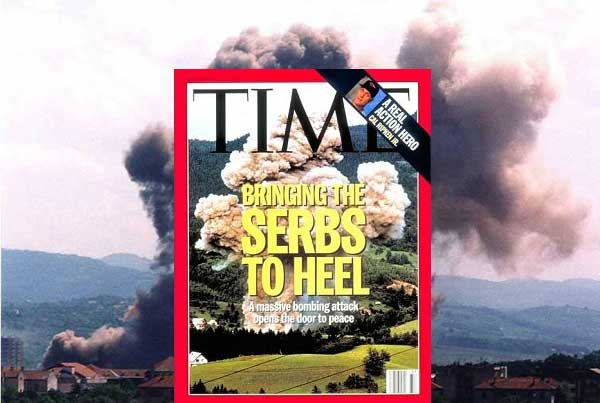 Bombardovanje Republike Srpske i naslovna stranica magazina Tajm. Izvor: Jadovno 1941.